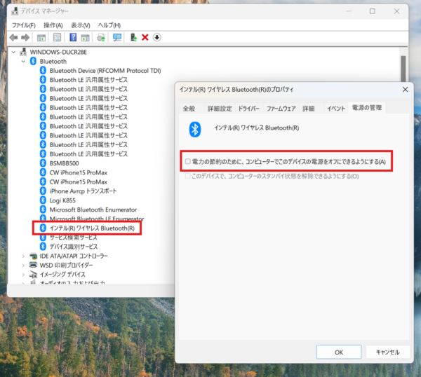 Bluetoothの接続についても、「電力の節約のために、コンピューターでこのデバイスの電源をオフにできるようにする」という項目が標準で”オン”に設定されています。